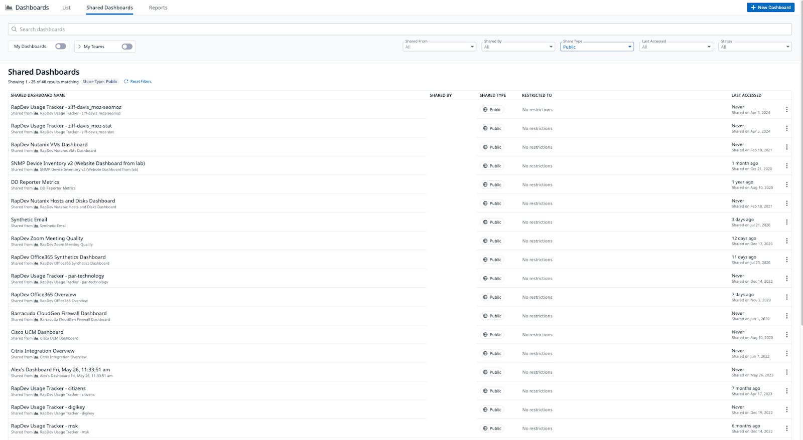 Short links are convenient - and dangerous. Public dashboards can expose internal KPIs or sensitive telemetry to anyone with the URL, even those outside of your Datadog environment. Audit dashboard permissions, revoke public links, and adopt RBAC so only appropriate teams can view or edit critical dashboards. When you need to share a dashboard externally, for example, to an executive or a viewing board in the office, you can create an invite link that can only be accessed by specific emails. To audit these dashboards, simply click into “Shared Dashboards” at the top of the Dashboards view and filter “Share Type” to “Public”.