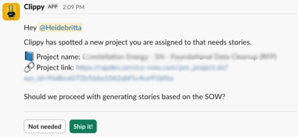 Clippy originated as a much simpler version in one of our 24-hour hackathons. The first version was a chatbot and over time, Clippy has evolved into workflows and AI agents integrating with a lot of the tools we use like Slack, ServiceNow, Notion, and HubSpot. We have dedicated workstreams focused on Clippy development and a backlog of Clippy features we’re excited to build.