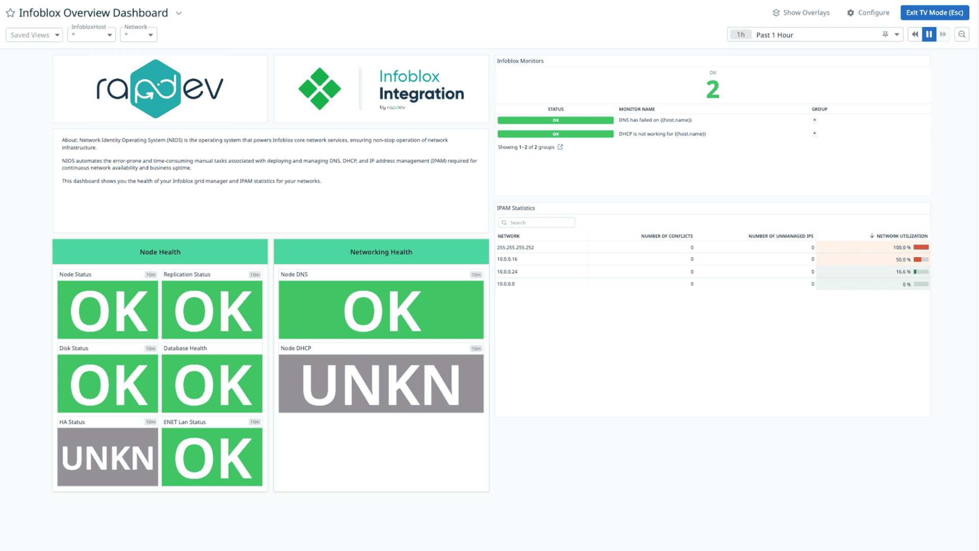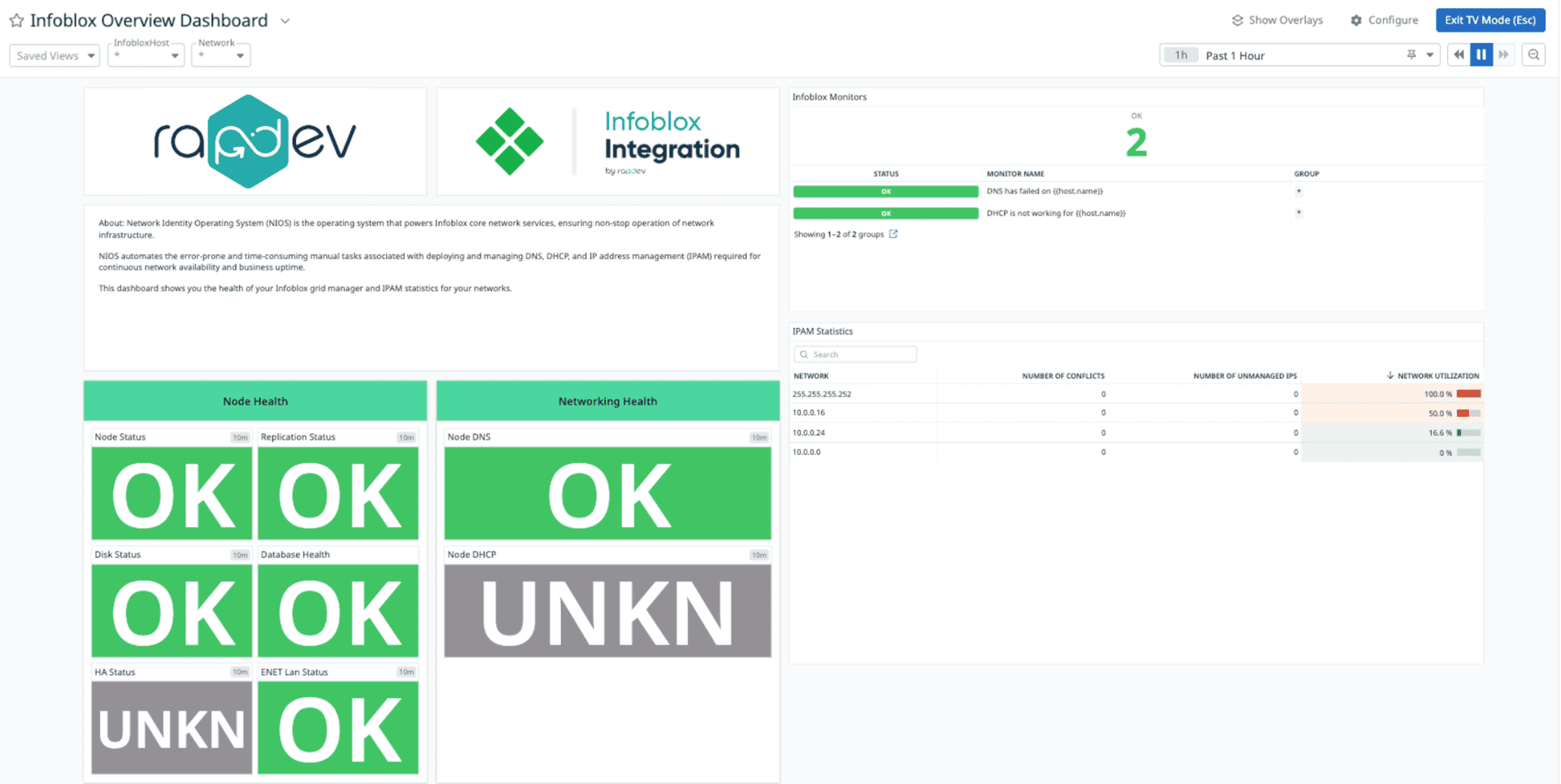 Monitor the health and performance of Infoblox DNS and DHCP nodes, tracking metrics such as node status, database health, high availability, and IP utilization.