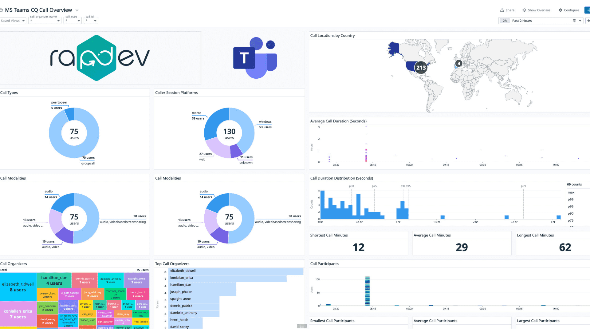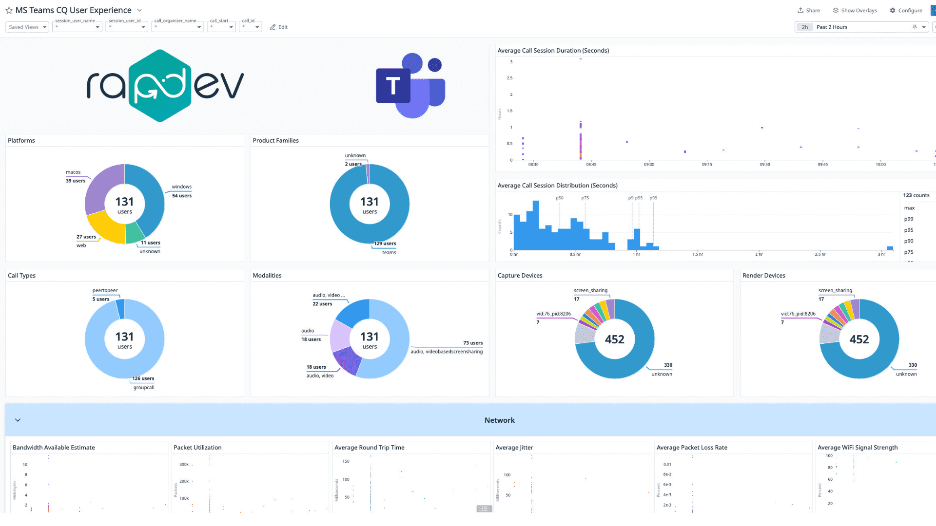 Dynamic dashboards provide visibility into call activity, session platforms, call types, participant counts, and more.